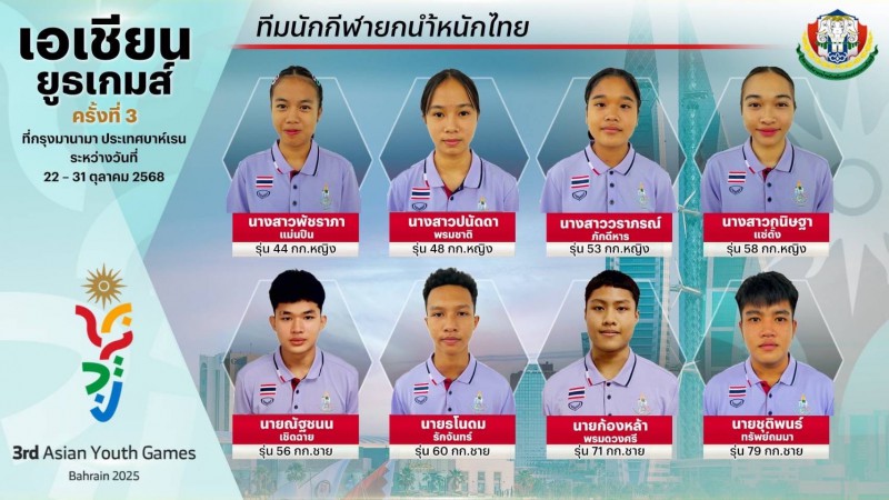สมาคมกีฬายกน้ำหนักสมัครเล่นแห่งประเทศไทย เปิดเผยรายชื่อ 8 นักกีฬายกน้ำหนักเยาวชนทีมชาติไทย ชุดเข้าร่วมมหกรรมกีฬาเอเชียนยูธเกมส์ ครั้งที่ 3 ระหว่างวันที่ 22-31 ตุลาคม 2568 ที่ประเทศบาห์เรน โดยแยกเป็นนักกีฬาหญิง 4 คน ได้แก่ นางสาวพัชราภา แม่นปืน รุ่น 44 กิโลกรัม, นางสาวปนัดดา พรมชาติ รุ่น 48 กิโลกรัม, นางสาววราภรณ์ ภักดีหาร รุ่น 53 กิโลกรัม และ นางสาวกนิษฐา แซ่ตั้ง รุ่น 58 กิโลกรัม ส่วนนักกีฬาชาย 4 คน ได้แก่ นายณัฐชนน เชิดฉาย รุ่น 56 กิโลกรัม, นายธโนดม รักจันทร์ รุ่น 60 กิโลกรัม, นายก้องหล้า พรมดวงศรี รุ่น 71 กิโลกรัม และ นายชุติพนธ์ ทรัพย์ถมมา รุ่น 79 กิโลกรัม