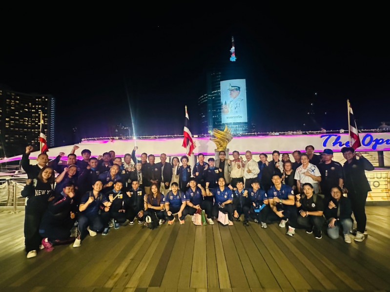 พลตรี อินทรัตน์ ยอดบางเตย นายกกิตติมศักดิ์ สมาคมกีฬายกน้ำหนักสมัครเล่นแห่งประเทศไทย, นางบุษบา ยอดบางเตย ประธานที่ปรึกษา สมาคมกีฬายกน้ำหนักฯ พร้อมด้วย คณะกรรมการบริหาร, เจ้าหน้าที่ประจำสำนักงาน, ผู้ฝึกสอน และนักกีฬายกน้ำหนักทีมชาติไทย ชุดมหกรรมกีฬาซีเกมส์ ครั้งที่ 33 ร่วมถ่ายภาพเป็นที่ระลึก ณ ท่าน้ำหน้าไอคอนสยาม เมื่อช่วงค่ำวันที่ 18 ธันวาคม 2568 หลังล่องเรือรับประทานอาหารค่ำ เพื่อฉลองชัยให้นักกีฬาที่ทำผลงานยอดเยี่ยมแข่งขันครบ 14 รุ่น คว้ามาได้ 9 เหรียญทอง, 2 เหรียญเงิน, 3 เหรียญทองแดง