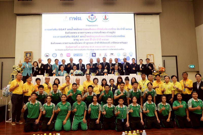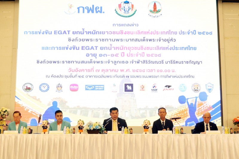 เมื่อวันที่ 7 ตุลาคม 2568 ที่ห้องประชุมชั้น 25 อาคารเฉลิมพระเกียรติ 7 รอบ พระชนมพรรษา การกีฬาแห่งประเทศไทย (กกท.) กรุงเทพฯ นายนำพล โพธิวงศ์ ผู้อำนวยการฝ่ายกุลยุทธ์ความยั่งยืน ผู้แทนผู้ว่าการการไฟฟ้าฝ่ายผลิตแห่งประเทศไทย (กฟผ.), พลเอกวิสุทธิ์ เดชสกุล เลขาธิการสมาคมกีฬายกน้ำหนักสมัครเล่นแห่งประเทศไทย, นายอนุพงศ์ สุขสมนิตย์ ผู้ว่าราชการจังหวัดศรีสะเกษ, นายวิทยา วิรารัตน์ นายกสโมสรกีฬายกน้ำหนักจังหวัดศรีสะเกษ และ นายสมโภชน์ ยิ้มพลอย ที่ปรึกษาและประธานฝ่ายจัดการแข่งขัน สมาคมกีฬายกน้ำหนักสมัครเล่นแห่งประเทศไทย แถลงข่าวจัดการแข่งขัน EGAT ยกน้ำหนักเยาวชนชิงชนะเลิศแห่งประเทศไทย ประจำปี 2568 ชิงถ้วยพระราชทานพระบาทสมเด็จพระเจ้าอยู่หัว และ การแข่งขัน EGAT ยกน้ำหนักยุวชนชิงชนะเลิศแห่งประเทศไทย ประจำปี 2568 ชิงถ้วยพระราชทานสมเด็จพระเจ้าลูกเธอ เจ้าฟ้าสิริวัณณวรี นารีรัตนราชกัญญา
