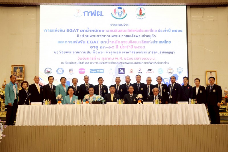 เมื่อวันที่ 7 ตุลาคม 2568 ที่ห้องประชุมชั้น 25 อาคารเฉลิมพระเกียรติ 7 รอบ พระชนมพรรษา การกีฬาแห่งประเทศไทย (กกท.) กรุงเทพฯ นายนำพล โพธิวงศ์ ผู้อำนวยการฝ่ายกุลยุทธ์ความยั่งยืน ผู้แทนผู้ว่าการการไฟฟ้าฝ่ายผลิตแห่งประเทศไทย (กฟผ.), พลเอกวิสุทธิ์ เดชสกุล เลขาธิการสมาคมกีฬายกน้ำหนักสมัครเล่นแห่งประเทศไทย, นายอนุพงศ์ สุขสมนิตย์ ผู้ว่าราชการจังหวัดศรีสะเกษ, นายวิทยา วิรารัตน์ นายกสโมสรกีฬายกน้ำหนักจังหวัดศรีสะเกษ และ นายสมโภชน์ ยิ้มพลอย ที่ปรึกษาและประธานฝ่ายจัดการแข่งขัน สมาคมกีฬายกน้ำหนักสมัครเล่นแห่งประเทศไทย แถลงข่าวจัดการแข่งขัน EGAT ยกน้ำหนักเยาวชนชิงชนะเลิศแห่งประเทศไทย ประจำปี 2568 ชิงถ้วยพระราชทานพระบาทสมเด็จพระเจ้าอยู่หัว และ การแข่งขัน EGAT ยกน้ำหนักยุวชนชิงชนะเลิศแห่งประเทศไทย ประจำปี 2568 ชิงถ้วยพระราชทานสมเด็จพระเจ้าลูกเธอ เจ้าฟ้าสิริวัณณวรี นารีรัตนราชกัญญา
