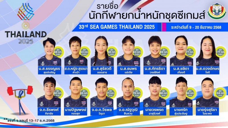 การแข่งขันกีฬายกน้ำหนักในมหกรรมซีเกมส์ ครั้งที่ 33 มีกำหนดระหว่างวันที่ 13-17 ธันวาคม 2568 ที่โรงยิมเนเซี่ยม โรงเรียนกีฬาจังหวัดชลบุรี แบ่งการแข่งขันเป็นหญิง 7 รุ่น และชาย 7 รุ่น ทั้งนี้ทีมไทยส่งนักกีฬาชิงชัยครบทุกรุ่น รวม 14 คน ประกอบด้วย นักกีฬาหญิง 7 คน ดังนี้ นางสาวธรรญธร สุขข์เจริญ รุ่น 48 กิโลกรัมหญิง / สิบตรีหญิง สุรจนา คำเบ้า รุ่น 53 กิโลกรัมหญิง / นางสาวสุรัสวดี ยอดสาร รุ่น 58 กิโลกรัมหญิง / นางสาวธนพร แซ่เตีย รุ่น 63 กิโลกรัมหญิง / นางสาวภัทรธิดา วงษ์สิงห์ รุ่น 69 กิโลกรัมหญิง /นางสาวชลิดา เที่ยงดี รุ่น 77 กิโลกรัมหญิง /นางสาวดวงอักษร ใจดี รุ่นมากกว่า 77 กิโลกรัมหญิง