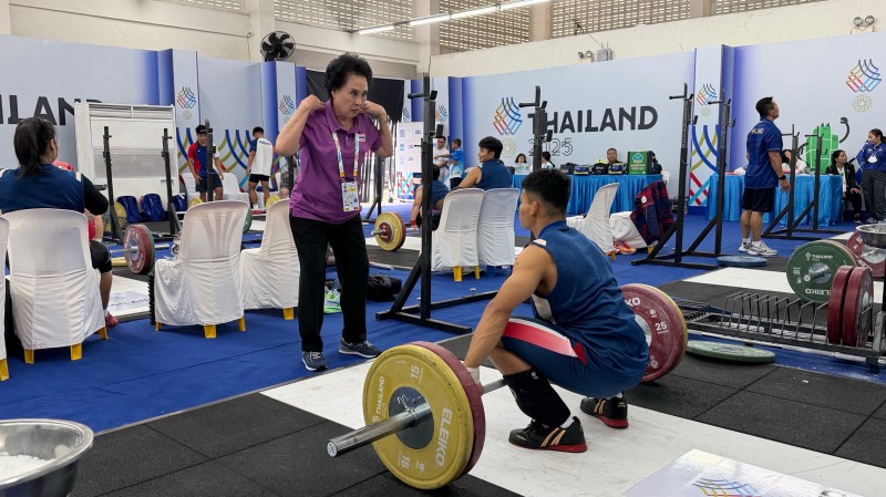 “มาดามบุษ” นางบุษบา ยอดบางเตย ประธานที่ปรึกษา สมาคมกีฬายกน้ำหนักสมัครเล่นแห่งประเทศไทย ดูแลการฝึกซ้อมของนักกีฬายกน้ำหนักทีมชาติไทยชุดเข้าร่วมการแข่งขันกีฬาซีเกมส์ ครั้งที่ 33 อย่างใกล้ชิด ที่โรงยิมเนเซี่ยม โรงเรียนกีฬาจังหวัดชลบุรี เมื่อช่วงบ่ายวันที่ 12 ธันวาคม 2568